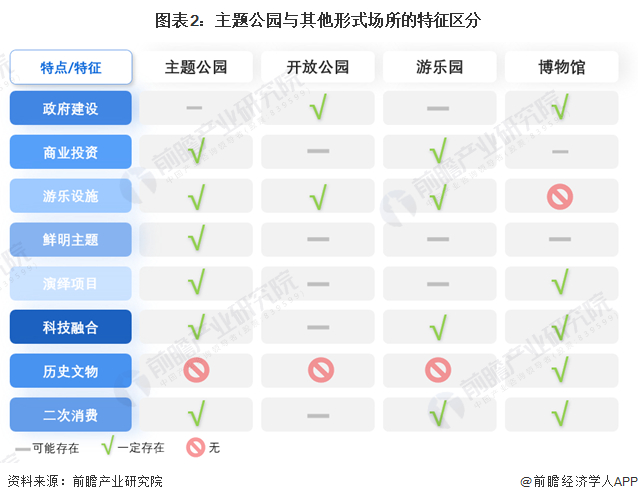 根据《关于规范主题公园建设发展的指导意见》中规定,主题公园是以营利为目的兴建的,占地、投资达到一定规模,实行封闭管理,具有一个或多个特定文化旅游主题,为游客有偿提供休闲体验、文化娱乐产品或服务的园区。主要包括以大型游乐设施为主体的游乐园,大型微缩景观公园,以及提供情景模拟、环境体验为主要内容的各类影视城、动漫城等园区。政府建设的各类公益性的城镇公园、动植物园等不属于主题公园。