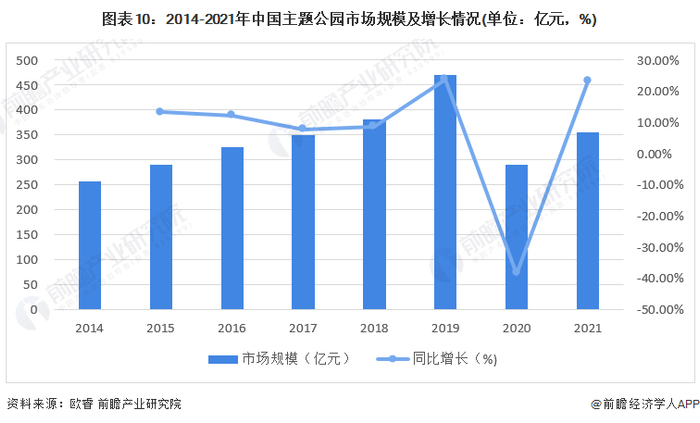 根据欧睿国际数据显示,2014-2019年我国主题公园市场规模稳步增长,2019年规模已达到469.97亿元,同比增长23.7%。2020年受疫情影响降至289.03亿元,2021年恢复至355亿元。