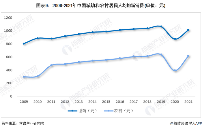 2009-2019年,城镇居民人均旅游消费由801.1元提升至1062.64元,而农村居民人均旅游消费由295.3元提升至634.66元。2020年新冠疫情阻碍了人们的出行,人均消费也跌入近10年低谷,2020年人均消费仅774.14元,而2021年人均每次旅游消费899.28元,同比增长16.2%。城镇居民旅游人均1009.57元/次;农村居民旅游人均消费613.56元/次。随着城乡居民收入的提高,旅游消费带给城乡居民的经济压力越来越小,尽管疫情阻止人们出游,但一旦恢复正常出行,人们的文化和旅游消费依旧保持活力。