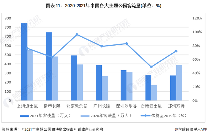 2020年疫情给主题公园客流量带来了严重的打击。由于作为最大市场及客源地的中国一直执行着较为严格的防疫政策,中国整体市场恢复至2019年的50%~55%。其中2021年客流量最高的是上海迪士尼,达848万人次,恢复至2019年的76%;其次是珠海横琴长隆海洋旅游度假区,客流量达745万人,恢复至2019年63%;恢复最高的是北京欢乐谷,2021年客流量493万人。