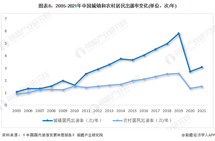 随着城镇化率的提高,2005-2019年,城镇居民人均出游率增速大大提升,由0.84次/年提升至5.8次/年,农村居民人均出游率逐年上升,由0.61次/年提升至2.55次/年。2020年疫情阻止了城乡居民出行,2021年疫情有所缓和,人们恢复出行,但局部疫情使得人们出行更为谨慎。2021年城镇居民人均出游率在3.07次,农村居民出游率在1.51次。