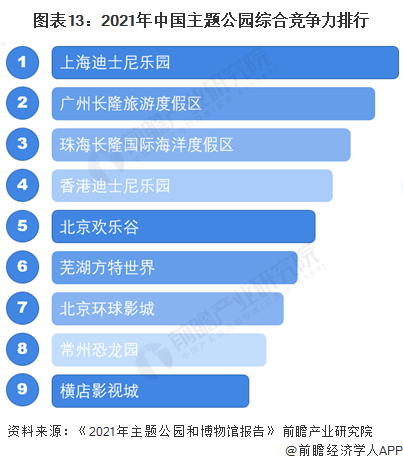 《2021年主题公园和博物馆报告》显示,2021年全球前25个主题乐园游客数量超过1.4亿人次,同比增长70%,相当于2019年56%的水平。中国内地和中国香港地区共有6个主题公园跻身前25名,其中包括上海迪士尼乐园,广州长隆欢乐世界、珠海长隆海洋王国、香港迪士尼乐园、北京欢乐谷。不过该报告也特别指出,由于疫情期间全球各地区的运营条件有所差异。根据客流量以及各机构统计的综合关注度,2021年中国主题公园综合竞争力排名如下: