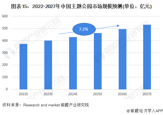 未来默林娱乐、六旗娱乐、团聚公园集团等国际知名主题公园运营商将相继进入中国市场,为中国主题公园市场带来新鲜血液,激发与满足更多潜在用户需求。根据美国Research and market对中国主题公园的预测,未来5年预计将以7.2%的年均复合增长率发展,2027年我国主题公园市场规模预计突破500亿元。