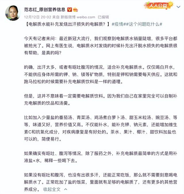 中国农业大学食品学院营养与食品安全系副教授范志红在个人微博发文表示,居民在家完全可以自制补充电解质的饮品,如茶水、椰汁等,以及番茄汤、白萝卜煮鸡汤等汤羹。