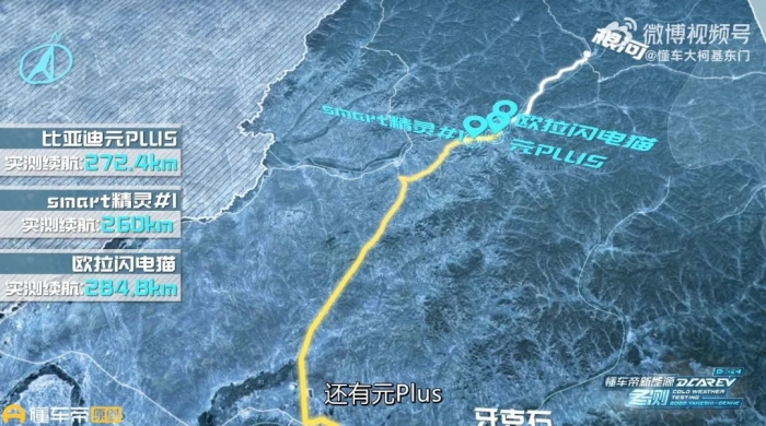 低温续航测试。按照其测试的要求,车辆为满电状态,车辆负载1名驾驶员,空调为24℃自动模式下,使用经济、ECO等省电的驾驶模式。测试方法为,车辆充满电后统在0℃的暖库里静置一夜后出发,当车辆电量为0%时记录总行驶里程。