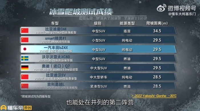 此次懂车帝新增爬坡测试,旨在检验车辆的扭矩分配及抓地力。根据测试要求,冰雪坡道最大坡度37.5°,使用加速最快的驾驶模式,轮胎均更换为原厂尺寸的雪地胎,车辆从起点出发,全力加速后无法继续爬坡记录最远位置。从测试来看,表现最好的是唐DM,爬坡距离达到34.5m,其次是smart精灵#1、一汽丰田bZ4X均为29.5m。而表现最差的是极氪001,其爬坡距离仅15.0m,是唯一一款爬坡低于20.0m的电动车。