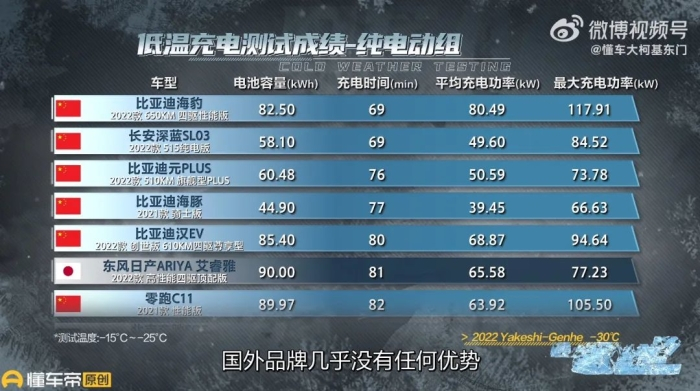 充电测试。按照其测试的要求,表显电量耗至0%后开始充电,充电过程中关闭车内用电器,统一使用120kW直流充电桩。据懂车帝测试,低温充电表现最好的是比亚迪海豹和长安深蓝SL03,两款车型的充电时间均为69分钟,排名第三的是元PLUS,充电时长为76分钟。除了微型车外,表现最差的车型是一汽丰田bZ4X,最大充电功率仅42.9kW,充电时长达到423分钟。此前,媒体曾报道海外丰田bZ4X存在充电异常问题,在严寒环境下会出现无法充电,虽然测试车辆未出现无法充电的状况,但其表现还是令人难以恭维的。