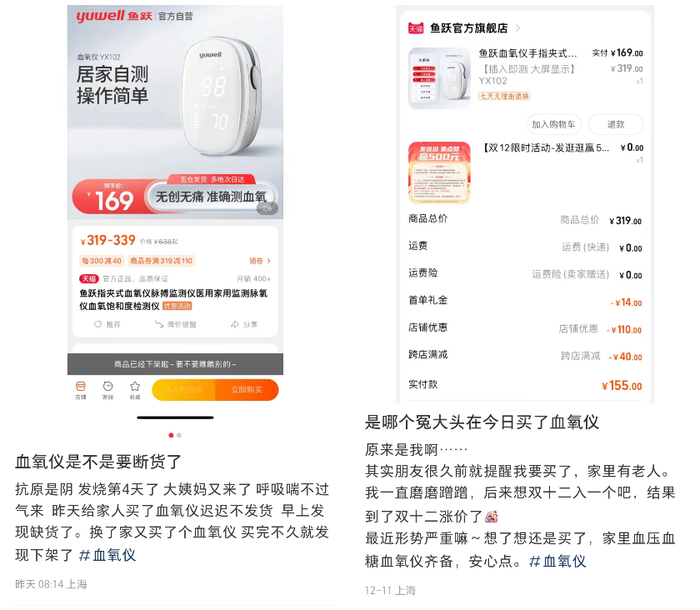 此外,在一些社交媒体上也有网友称,自己购买的血氧仪迟迟不发货,并发现有明显加价情况。