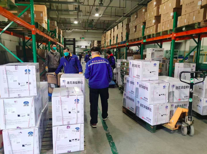 “来拉连花清瘟吗?您顺序排队。”华润医药商业物流配送中心的大门外,成箱的连花清瘟胶囊堆得一人多高。来拉货的车辆在门外排起了长队,登记、核对、清点药品数量,一切工作都在紧张有序地进行中。
