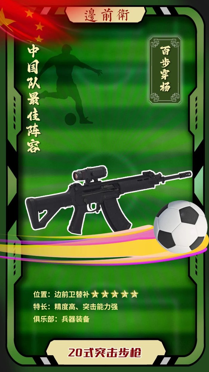 优势分析:20式突击步枪是兵器装备集团俱乐部这批新签约球员中的代表性“狠角色”,精度高,突击能力强;带导轨,扩展能力强;模块化设计,可快速切换不同组件、不同模式,适应不同的进攻需求。