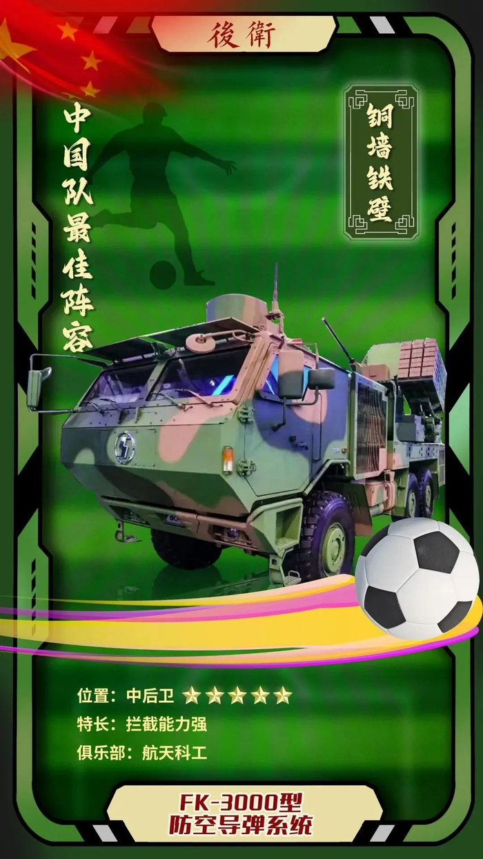 优势分析:FK-3000型防空导弹系统作为球队的主力中后卫,具有精准的预判和拦截能力。面对对手的反击,能够无死角地将危险化解掉。FK-3000还配备有“忠诚僚车”,能大幅拓展火力范围与拦截层次,很好地应对对方界外球和定位球,与福建舰组成了门将前方的“铜墙铁壁”。