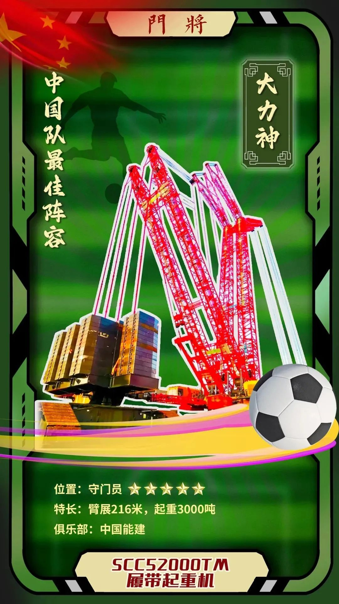 优势分析:SCC52000TM履带起重机作为球队的二号门将,有着独特的“臂展”优势,其长达216米的起重臂能够最大限度地覆盖球门范围。ta体力充沛,最大起重量达3000吨,掷出的手抛球对自家前锋非常友好。此外,ta还搭载了全方位可视化智能操作和智能故障诊断系统,同时配置无线遥控,真正做到“大块头”有“大智慧”。