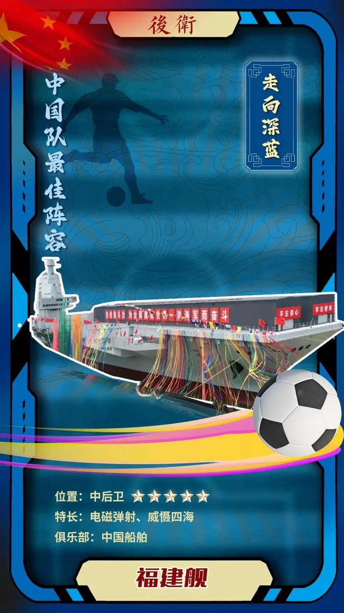 优势分析:今年6月17日命名的福建舰,虽是小将,实力却不容小觑。ta满载排水量8万余吨,力量大、吨位足、火力猛,足以与强势对手正面卡位。配置电磁弹射,福建舰能够抓住机会将球快速“弹”给前场队员,效率极高,可谓是其他球队最不想碰上的选手之一。