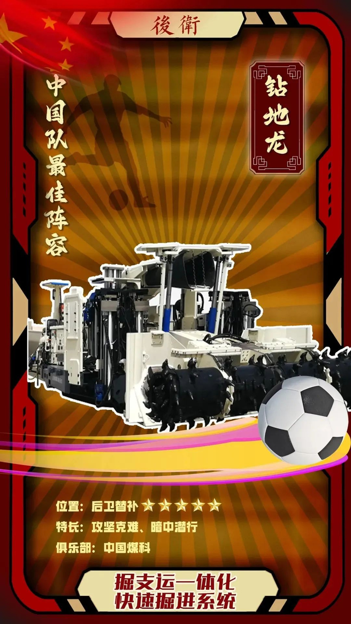 优势分析:掘支运一体化快速掘进系统是球场上“蛟龙”般的存在,掘进速度极快,为同类型球员平均速度的10倍以上,更是世界纪录的保持者。系统前方巨大的滚筒、旋转的利爪,仿佛是ta在向世界宣告:我在,球就在!