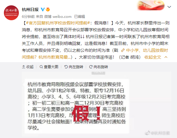 杭州中小学和幼儿园提前放寒假?市教育局工作人员:假消息