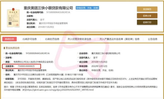 近日,国家企业信息公示系统显示,美团旗下重庆美团三快小额贷款有限公司发生工商变更,注册资本从50亿元增资至75亿元。