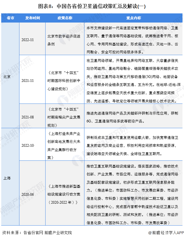 目前,我国卫星通信产业相关企业在多个省市均有布局,其中北京、浙江、广东等地产业聚集效益较好,尤其是北京聚集了上游卫星制造、卫星发射、地面设备、卫星通信运营等全产业链企业。根据国家“十四五”规划纲要和2035远景目标纲要,“十四五”期间,我国将推动航空航天等产业创新发展。目前,北京、上海、广东、浙江等省市纷纷出台卫星通信相关政策,多为鼓励、指导行业发展,主旨聚焦在统筹卫星产业、量子通信、移动通信网络等网路基础设施的发展。
