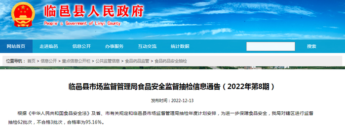 中国质量新闻网讯 近日,山东省临邑县市场监督管理局发布食品安全监督抽检信息通告(2022年第8期)。据通告,本次临邑县市场监督管理局抽检辖区内食品样品62批次,不合格3批次,合格率为95.16%。