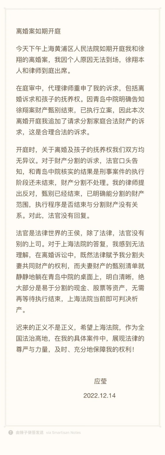 今年12月6日,应莹在庭审前预告称,对法院重新启动离婚案感到突然。“离婚从2019年上半年立案到2022年的年末,离婚案时间跨度整整三年半……现在又突然地启动了,我和徐翔的离婚案即将会有结果。“