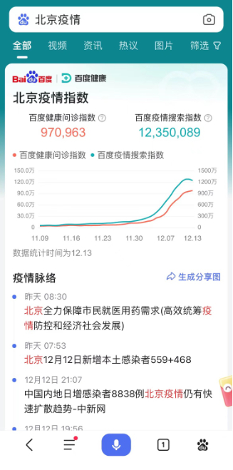 据悉,百度疫情指数包括百度疫情搜索指数和百度健康问诊指数两大数据维度。百度疫情搜索指数反映了大众对新冠症状、防疫物资等需求的搜索关注程度与持续变化情况,百度健康问诊指数通过统计当地互联网用户在百度健康使用呼吸内科问诊咨询量等数据,形成相关指数,帮助网民感知相关城市疫情走势,及时做好防护措施。在百度APP中,用户通过查询“地区名+疫情”等关键词,如“北京疫情”,即可了解疫情实时动态。