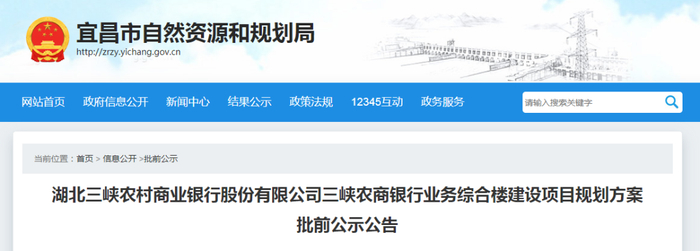 湖北三峡农村商业银行股份有限公司三峡农商银行业务综合楼建设项目位于宜昌高新区东山园区发展大道西北侧(居然之家旁),该项目方案规划咨询论证,容积率、建筑密度、绿地率、停车位等经济技术指标满足规划条件和相关规范要求。宜昌市自然资源和规划局拟批准该方案,根据《中华人民共和国行政许可法》《中华人民共和国城乡规划法》的相关规定,现将规划方案进行公示。公示时间:2022年12月13日至2022年12月21日(7个工作日)。公示期间,有关单位和个人如有异议可通过以下方式向宜昌市自然资源和规划局高新区分局反映意见或建议。