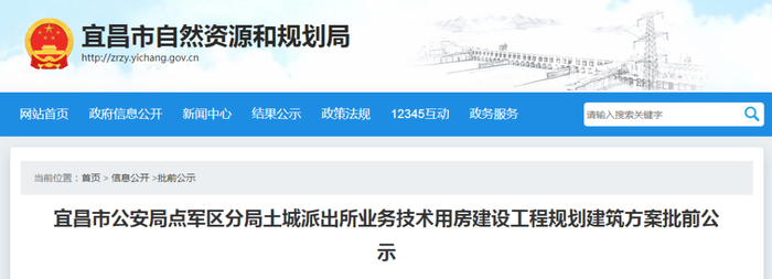宜昌市公安局点军区分局土城派出所业务技术用房工程项目位于宜昌市点军区土城乡李家坝村,宜昌市自然资源和规划局拟批准该项目方案,根据《中华人民共和国城乡规划法》及《湖北省城乡规划条例》等相关规定,现将该项目方案主要内容予以公示,公示时间从即日起至2022年12月20日为止。有关单位或个人对该项目方案有任何意见或建议的,可在公示期间通过以下方式向宜昌市自然资源和规划局点军区分局反映。