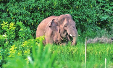 亚洲象在云南省普洱市江城哈尼族彝族自治县一处村庄觅食。新华社 发