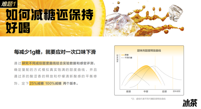 郝佳说,市面上常见的冰茶,一直是高糖饮料,用户喜爱它的高酸、高甜的口味,既能解渴,又能解腻,如果口味重一点,反而会成为腻感源,如果口味不重,又会喝着不爽。“因此制作一款口感极佳的减糖饮料,通常需要上百次尝试,淘汰率是99%。”