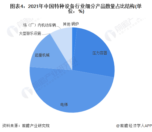 从特种设备类型来看,主要包括压力容器、电梯、起重机械、锅炉等,其中,电梯数量占比超过45%、压力容器占比超过25%、起重机械占比超过15%。