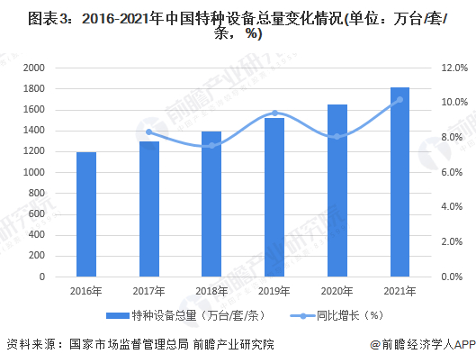 2016-2021年全国特种设备总量逐年增长,年均复合增速为8.7%。截至2021年年底,全国特种设备总量超过1800万台。全国特种设备总量的快速增长带动了国内特种设备检测市场的快速发展。