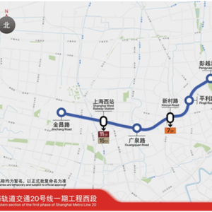 20号线一期西段工程线路将途经普陀、静安两区,自西向东经过真如副中心、大宁地区等主要区域,线路全长约7.2公里,共7座车站,其中3座为换乘站,未来可分别与1、7、11、15号线换乘。