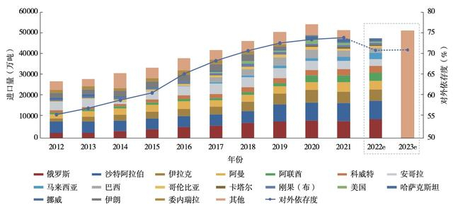 《报告》预计,2022年中国原油进口量5.01亿吨,对外依存度将降至70.9%。由于天然气进口同比下行,对外依存度降至42.5%。