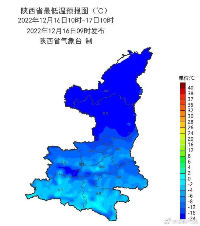 最低气温出现在17日早上,其中陕北北部-19~-17℃,陕北南部-17~-15℃,关中北部-13~-11℃,关中南部-8~-6℃,商洛-10~-8℃,汉中、安康-7~-4℃,秦岭山区-21~-15℃,巴山-12~-8℃。