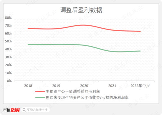 看上去利润率下降较多,很多媒体也都着重强调了这一点。但这其实不是个大问题,因为这类公司有一个特点:利润包含了生物资产公允价值的调整。