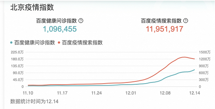 新十条之后,百度“北京疫情”的搜索指数一路上升,高峰时搜索人次超过1200万条。12月12日,北京市卫生健康委员会新闻发言人李昂介绍,12月11日,全市发热门诊就诊患者2.2万人次,是一周前的10倍。