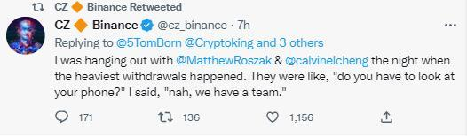 币安CEO赵长鹏周五发推轻描淡写地提及最近的客户提币,称“当最严重的提币发生时,”他我晚上正在和区块链投资者Matthew Roszak以及科技业企业家Calvin Cheng在一起,“他们问我,‘你是不是必须得看看你的手机?’,我说:‘不用,我们有个团队。’”