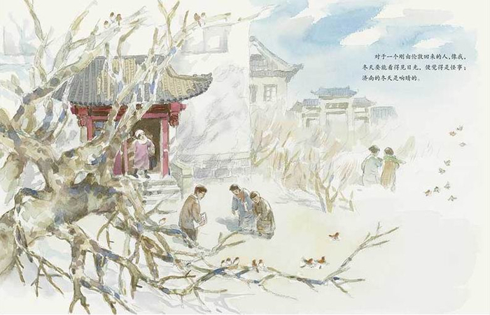 游学英伦多年的老舍先生来到位于“泉城”济南的齐鲁大学就任教职,将目光对准了济南的山水、生活。济南画家杨鹁将老舍先生笔下的济南用画作表现出来,青蓝色调的天空和远山,与银装素裹的济南城相映成趣,从中孩子们能看到居住其间的人们热气腾腾地生活,又饱含烟火气的温暖,会帮助孩子对这篇散文有更好的理解。
