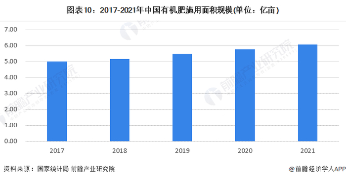 据国家统计局统计,2017年我国有机肥料肥料累积应用面积5亿亩以上(蔬菜、果树、甘蔗、中草药、烟草、粮食等)。根据“十三五”计划总结大会公布的信息来看,2020年我国有机肥料总体使用面积达到5.78亿亩的水平,2021施用面积进一步提升至6.06亿亩。