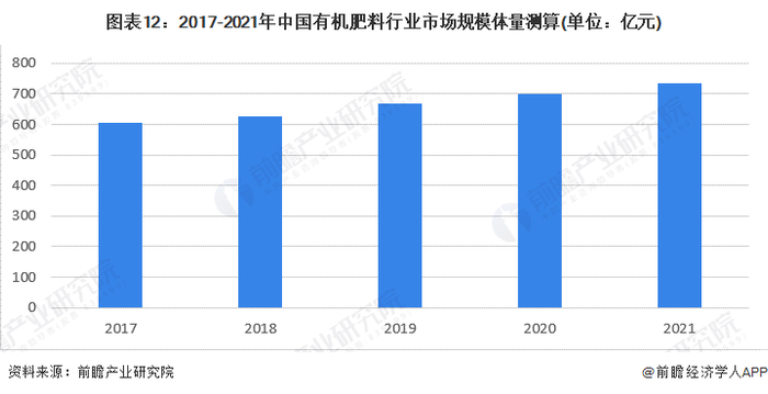 2021年我国有机肥料施用量约为7277万吨;在价格方面前瞻结合有机肥产量占比较大的秸秆肥和畜禽类粪便肥料的均价,得出有机肥料整体平均价格主要在1010元/吨的水平,在此口径下2021年中国有机肥料行业市场规模达到735亿元,过去5年的复合增长率达到4%。
