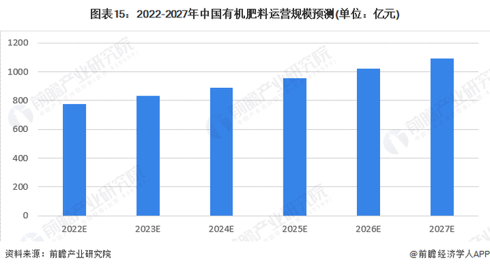 2015-2021年在国家大力推广和应用有机肥的推动下,国内企业加快了有机肥产能和产量的扩大。在我国《“十四五”全国农业绿色发展规划》等支持政策频出的背景下,我国有机肥料行业的发展将步入快车道,前瞻预计2022年中国有机肥料行业市场规模将达到近780亿元,预计到2027年达到1092亿元的水平,5年复合增长率维持在7%左右。