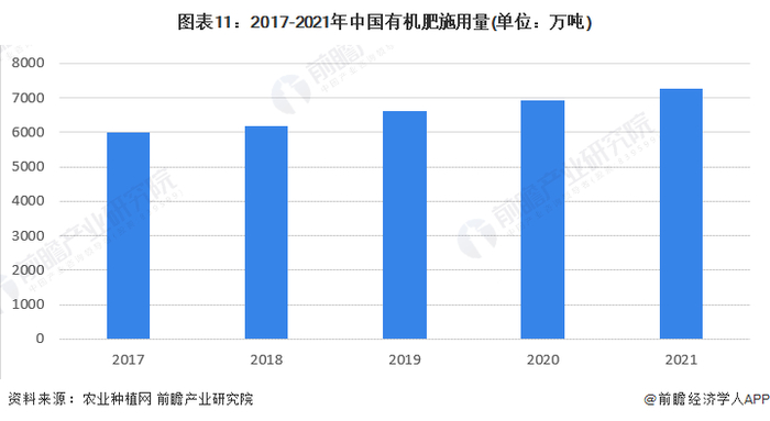 根据农村种植网和农村农业部提供的信息来看农作物种植工作中,有机肥正常施用量是每亩100-200公斤为宜。前瞻以每亩有机肥料使用量120公斤来测算,结合我国有机肥料施用土体规模,核算得出2021年我国有机肥料施用需求量已经达到7277万吨。
