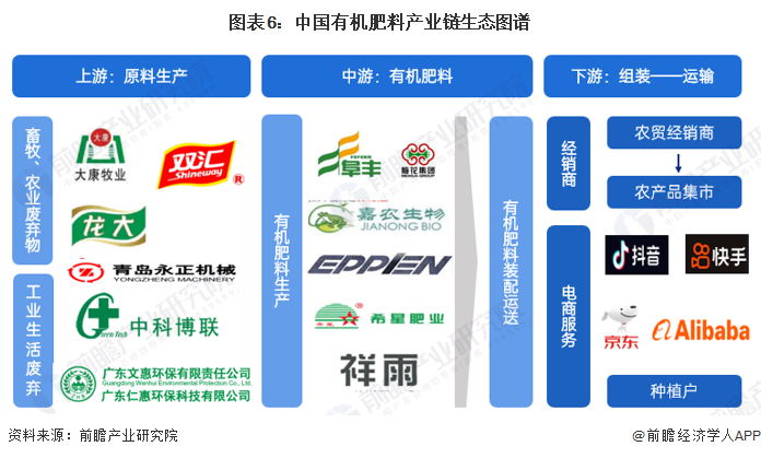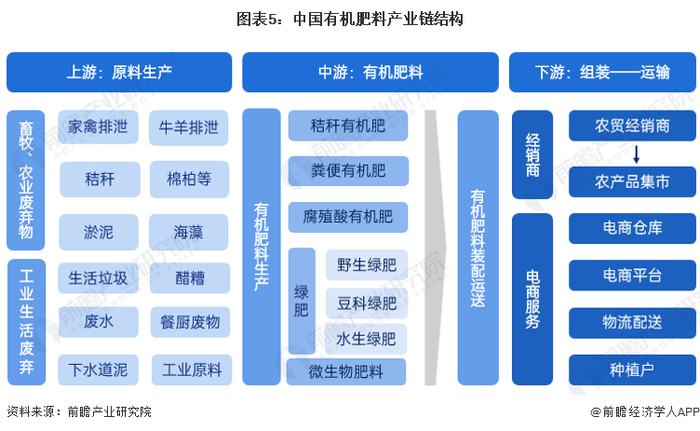 我国有机肥料产业链上游主要由畜牧、农业废弃物和工业生活废弃物组成,其中动物排泄物、秸秆和海藻等为有机肥料的主要原料来源。中游有机肥料可以分为秸秆肥、粪便肥和腐殖酸肥等,在下游的应用场景中,可以分为经销商——集市配送方式和电商平台方式,最终运送到相关种植单位手中: