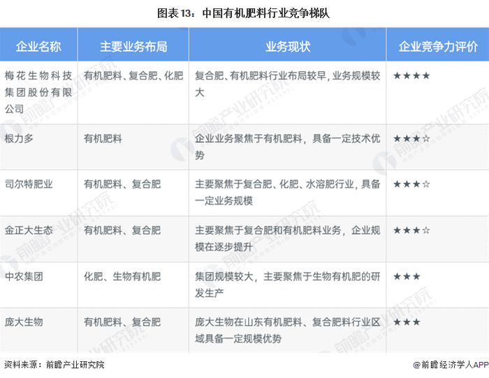 前瞻结合中国有机肥料行业主要企业的有机肥料业务营收规模和企业主要聚焦业务类型,并通过对比企业技术规模发展现状,总结出目前中国有机肥料行业企业竞争格局分布,综合来看目前行业内还未产生具备非常明显规模优势的企业,梅花生物科技集团在各方面具有一定的相对优势: