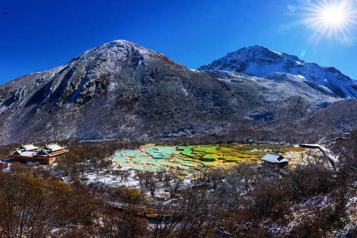 冬季的黄龙彩池与其他季节不同,若隐若现的半冰半水为冬日增添起不一样的情调,它悄悄地与微风、与蓝天诉说着冬日的到来。池面覆上薄薄一层冰雪,清透的池水在碎冰下循着微风轻轻荡漾,共同点缀着冬日。万物陷入冬眠,天地更显宁静,漫步于黄龙的栈道,步步而上,慢慢悠悠地欣赏伫立于顶端的彩池。