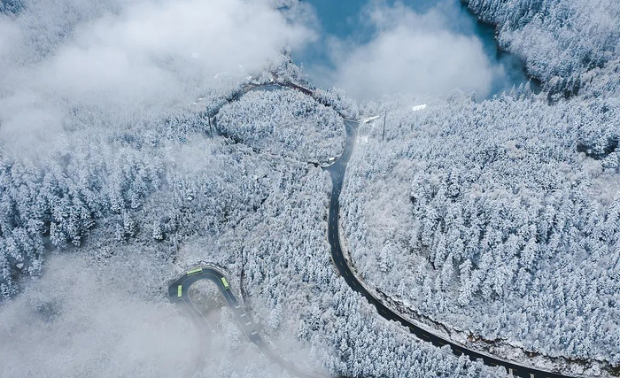 失去叶片的林涛树海延续着秋的色彩,那暗红的树姿婀娜娉婷,好似穿着舞裙的少女。缠绕在山腰的云雾,也为九寨沟的冬日增添了缥缈和虚幻,让人愈发对这冰雪世界充满好奇与热爱。
