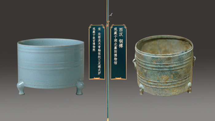 “天下宋瓷,汝窑为魁”。在册的传世汝窑整器,至今已不足百件,北宋汝窑淡天青釉弦纹三足樽式炉就是其中的至尊。如玉一般温润,像冰一般的清澈,配上不规则的冰裂纹,呈现出“雨过天青云破处”的诗意之美。尤其重要的是,它直口平底,仿制的是汉代的铜樽,体现出当时的复古思潮,也呈现出汉风宋韵“至简而详,至约而博”的共同审美品位,更体现出中华文化基因的一脉相承。
