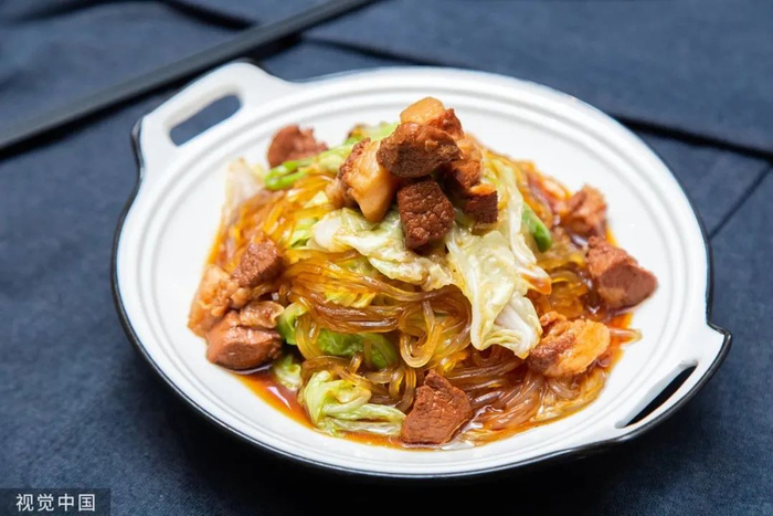 猪肉炖粉条是东北名菜,其实“白菜猪肉炖粉条”才是更常见的形态。白菜清清淡淡的,可是特别能吸油水,还容易入味,粉条保证了汤汁的浓厚,搭配大块的五花肉,这样肥而不腻,每一口都不寡淡。