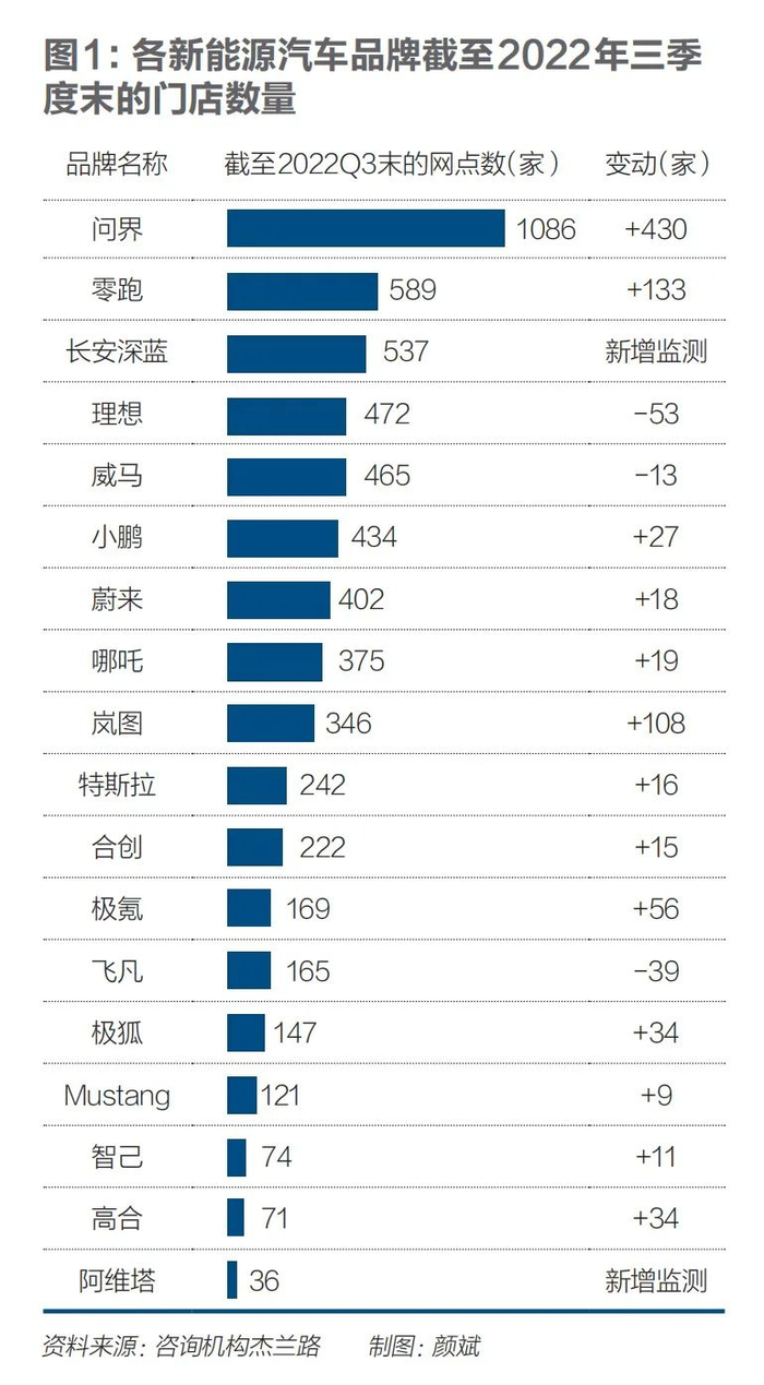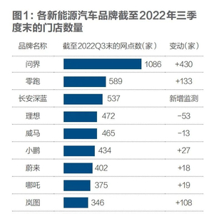 咨询机构杰兰路盘点了18家初创汽车品牌的门店数量发现,截至2022年三季度末,网点最多的当属问界,成为唯一网点数破千的品牌。紧随其后的是零跑,已经达到589家。排名第三是长安深蓝,已经达到537家,超过理想、威马、小鹏等新势力。