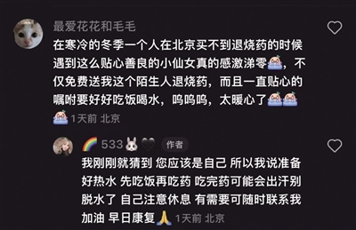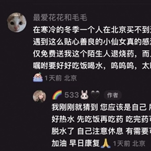 后来那个发烧到39.4℃的女孩在社交平台上给她留言,“在寒冷的冬季,一个人在北京买不到退烧药的时候,真的感激涕零。”