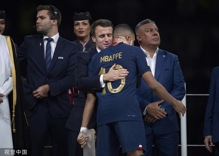 法国总统马克龙安慰姆巴佩。这些年,他一直支持着姆巴佩。